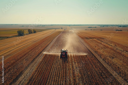 Fototapeta premium Aerial View of Tractor Spraying Crops in a Field