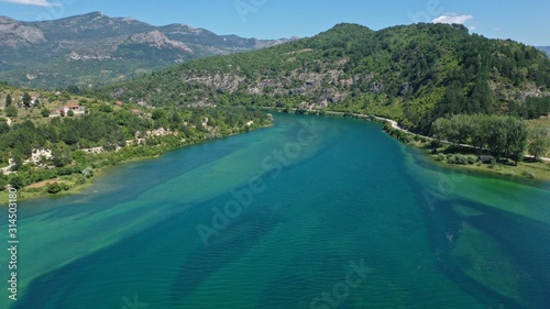 Fototapeta premium Aerial view of Trebisnjica river mountainous valley, Lastva village, Bosnia and Herzegovina. Turquoise water, green hills.