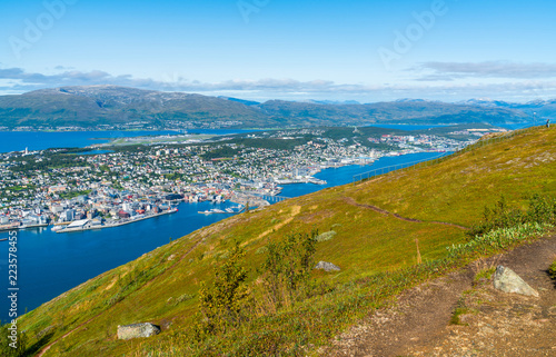 © beataaldridge, Fototapeta premium Aerial view of Tromso and Tromsoysundet strait in Norway