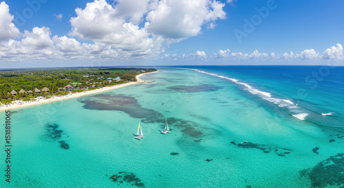 © agra, Obraz premium Aerial View of Tropical Beach Turquoise Waters, White Sand, and Sailing Boats