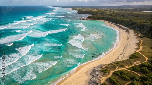 Obraz premium Aerial View of Turquoise Ocean Waves and Sandy Beach – Tropical Paradise...