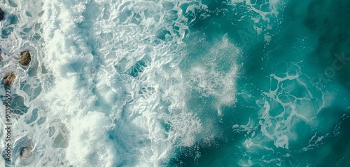 Naklejka premium Aerial view of turquoise ocean waves crashing against rocks, creating white...