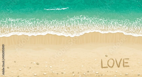 © KomandanSayur, Fototapeta premium Aerial view of turquoise ocean waves washing onto a sandy beach with the word love written in the sand creating a serene tropical escape