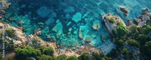 Fototapeta premium Aerial View of Turquoise Waters and Rugged Coastline, Overhead Perspective of...