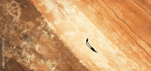 © Puchong, Fototapeta premium Aerial view of two figures walking on a vast, textured, ochre landscape. Striking contrast of human scale and expansive terrain.