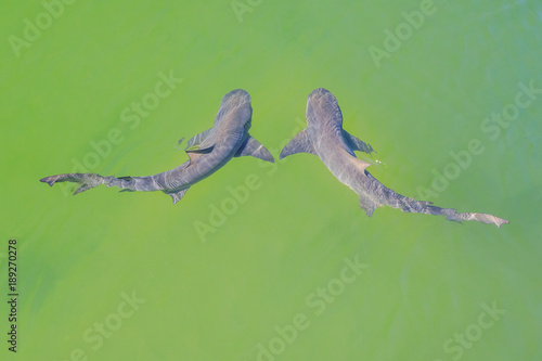 © bennymarty, Obraz premium Aerial view of two lemon sharks swimming in australian waters. Denham, in the Shark Bay, on coral coast, Western Australia.