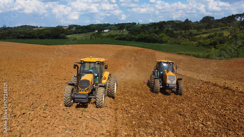 © Minhano, Obraz premium Aerial view of two tractors working in the field
