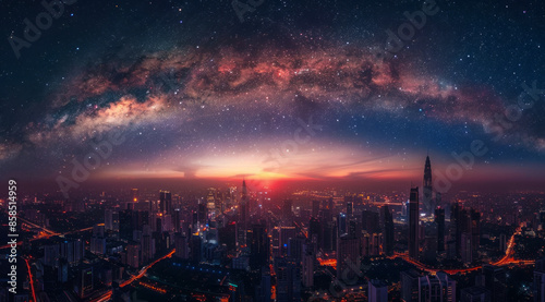 © Eliya, Fototapeta premium Aerial view of typical financial business city center skyline at sunset.