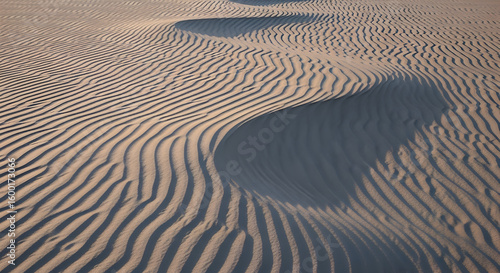 © Ali, Obraz premium Aerial view of undulating sand dunes with visible wind patterns and shadows at sunset