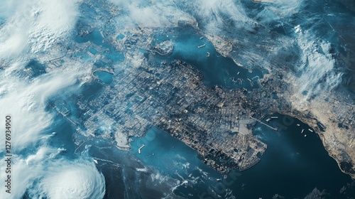 © Monchisa, Fototapeta premium Aerial View of Urban Landscape Under Dramatic Skies and Clouds