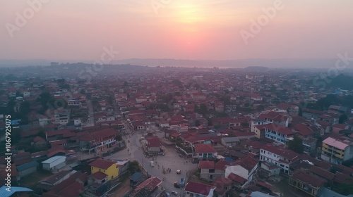 © Sampao, Fototapeta premium Aerial View of Urban Sunset Over a Vibrant Township