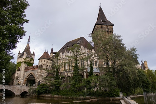 Fototapeta premium Aerial view of Vajdahunyad Castle under the blue sky , Budapest
