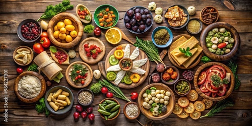© Four888, Fototapeta premium Aerial View Of Various Vibrant Circular-Shaped Foods And Ingredients Arranged Appetizingly On A Rustic Wooden Surface