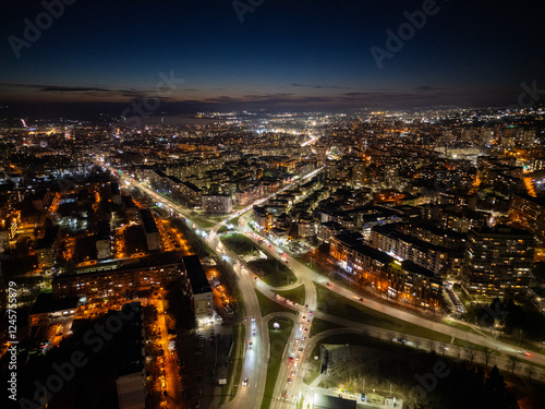 Obraz premium Aerial view of Varna, Bulgaria, at sunset, showcasing a vibrant cityscape with illuminated streets, moving traffic, and a glowing skyline. The coastal metropolis reflects urban energy and modern