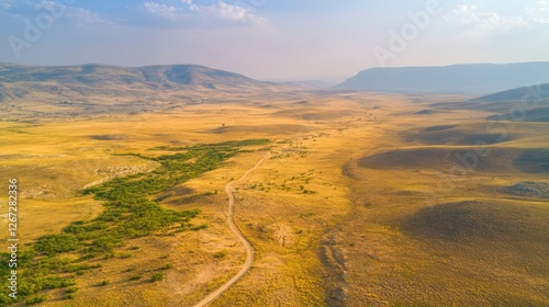 © pibi37.studio, Fototapeta premium Aerial view of vast arid plain in mountainous desert landscape at dusk