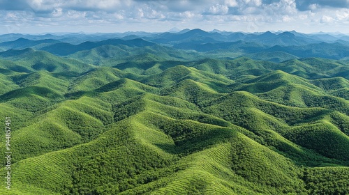 Fototapeta premium Aerial View of Vast Green Rolling Hills Under a Cloudy Sky, Showcasing the...
