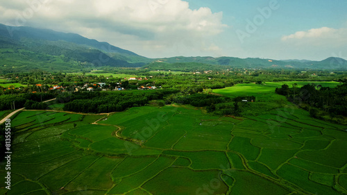 © fotoworld, Fototapeta premium Aerial view of verdant rice terraces with a meandering road, showcasing sustainable agriculture and rural beauty, perfect for Earth Day and World Environment Day themes