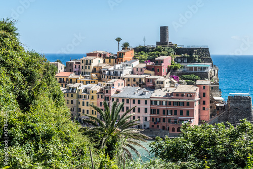 Obraz premium aerial view of Vernazza in the Cinque Terre with colorful houses and flowers