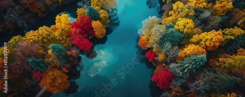 Naklejka premium Aerial view of vibrant autumn foliage surrounding a serene river, showcasing...