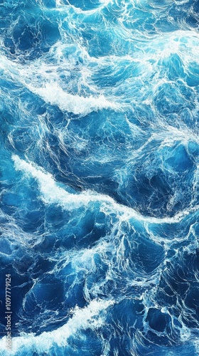 Obraz premium Aerial view of vibrant blue ocean waves crashing, creating dynamic patterns and textures in a serene natural setting.