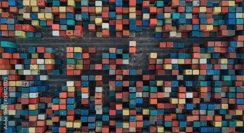 © Qstock, Fototapeta premium Aerial View of Vibrant Cargo Containers at Shipping Port, Enhancing Global Trade Efficiency and Logistical Management.