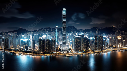 © siraphol, Naklejka premium Aerial view of vibrant city skyline night, showcasing illuminated buildings and reflections
