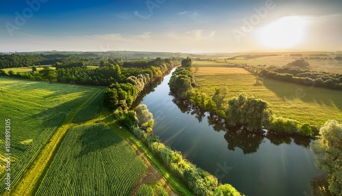 © Ellen, Naklejka premium aerial view of vibrant crops alongside a calm river with rich greenery and trees thriving under the sunlight