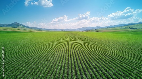 © Erisna Yolanda, Fototapeta premium Aerial view of vibrant green agricultural field with rows of crops under a bright sunny sky and distant mountains.
