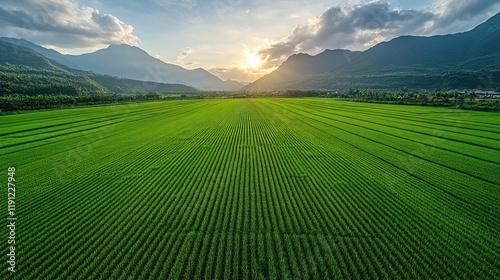 Fototapeta premium Aerial view of vibrant green rice paddy fields at sunset, surrounded by majestic mountains.