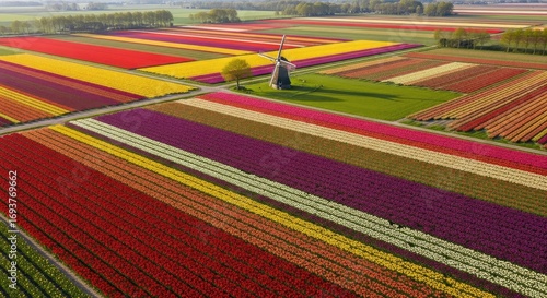 Obraz premium Aerial view of vibrant multi-colored tulip fields and a traditional windmill...