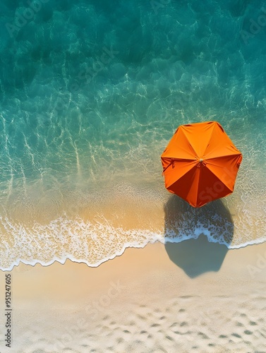 © LookChin AI, Naklejka premium Aerial View of Vibrant Orange Umbrella on Pristine Beach with Turquoise Waters
