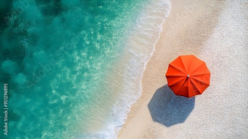 © LookChin AI, Naklejka premium Aerial View of Vibrant Red Umbrella on Pristine Beach with Turquoise Waters