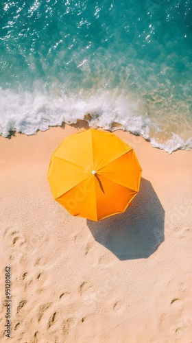 Naklejka premium Aerial View of Vibrant Yellow Sun Umbrella on a Pristine Summer Beach with...
