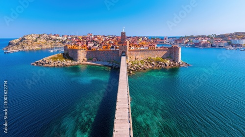 © Narongsag, Fototapeta premium Aerial View of Visby Gotland Island Sweden Medieval City Walls Bridge Clear Blue Wat