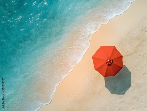 © LookChin AI, Naklejka premium Aerial View of Vivid Red Umbrella on Idyllic Summer Beach with Turquoise Ocean Waves