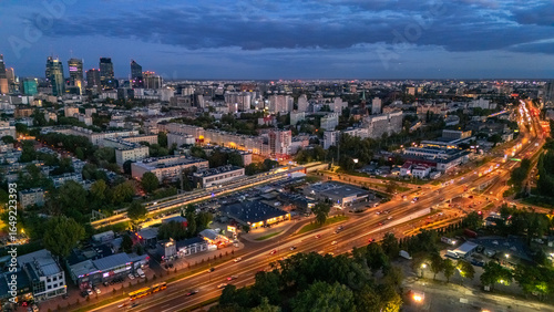 © MKavalenkau, Fototapeta premium aerial view of warsaw in the evening in summer with busy avenue