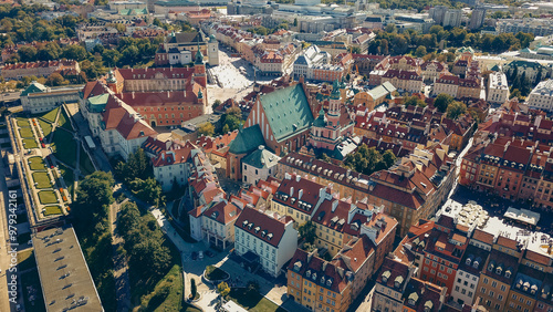 © Dave, Fototapeta premium Aerial view of Warsaw's historic architecture and vibrant rooftops during a sunny day in late summer