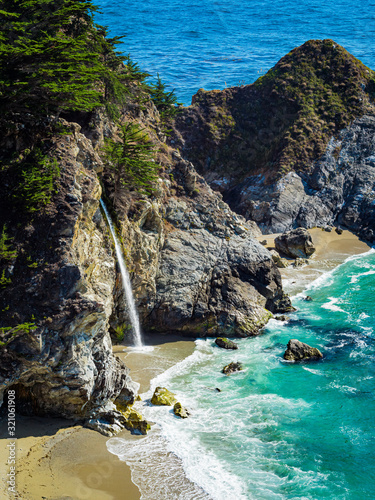 Fototapeta premium Aerial view of Water Fall McWay Falls Julia Pfeiffer Burns Park Big Sur California. McWay Falls a waterfall empties directly into the ocean.