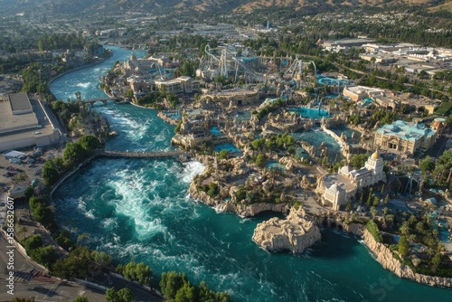 © IQRAM, Fototapeta premium Aerial view of water park, city, and mountains. Use tourism, travel