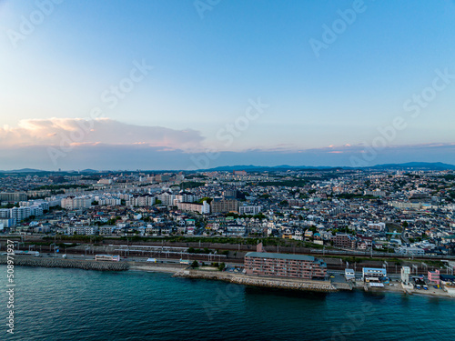 © Osaze, Fototapeta premium Aerial view of waterfront apartment and sprawling coastal development after sunset