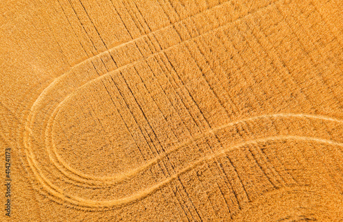 © Ryzhkov Oleksandr, Fototapeta premium Aerial view of wheat field with tractor tracks. Farm from drone view.