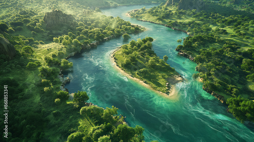 Obraz premium Aerial View of Winding River Through Lush Green Valley