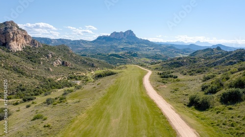 © KIMEHIME, Fototapeta premium Aerial view of winding road through mountain valley