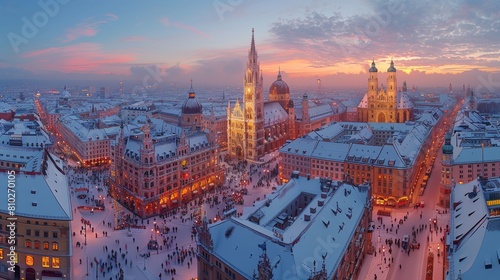 Obraz premium Aerial View of Winter Evening in Marienplatz, Munich with Snow-Covered...