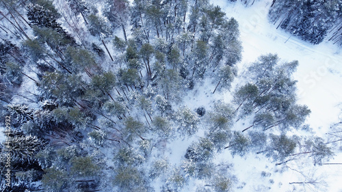 © baronred, Fototapeta premium Aerial view of winter forest. Pines and spruce winter background. Winter landscape from the air. Natural forest background with drone. Winter forest.