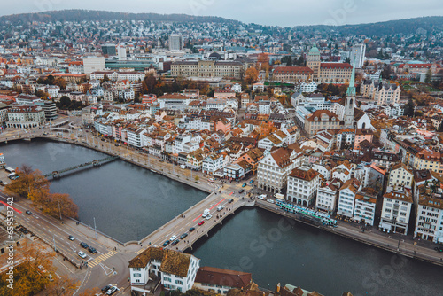 © oatawa, Fototapeta premium Aerial view of Zurich city center with Fraumunster Church and river Limmat at Lake Zurich from Grossmunster Church on autumn, Canton of Zurich, Switzerland