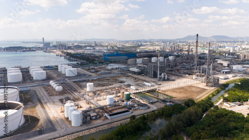 © eakarat, Obraz premium Aerial view oil and gas chemical tank with oil refinery plant business and industry power energy chemical barrel. for Transportation in Thailand