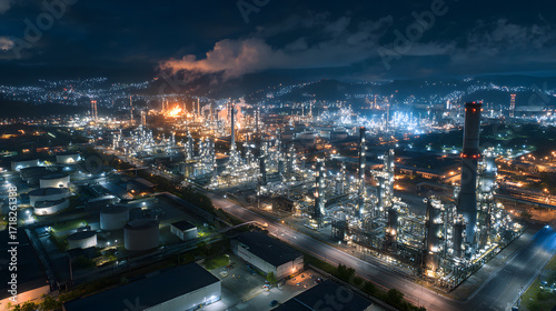© Prasanth, Fototapeta premium Aerial view oil and gas refinery plant at night, Global business energy logistic transportation, Oil and gas refinery petrochemical industrial, Petrochemical refinery industrial energy supply chain.