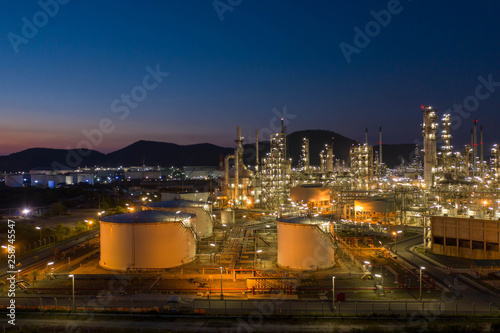 © Sunday Stock, Fototapeta premium Aerial view. Oil refinery factory and oil storage tank at twilight and night. Petrochemical Industrial.