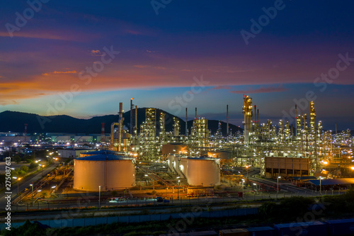 © Sunday Stock, Fototapeta premium Aerial view. Oil refinery factory and oil storage tank at twilight and night. Petrochemical Industrial.